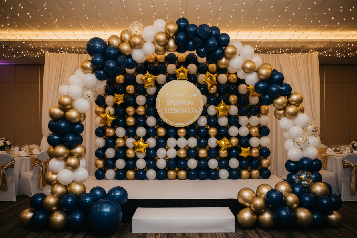 Family and class reunions deserve a setup that brings everyone together and looks amazing in photos. We create balloon décor and backdrop moments that welcome guests, highlight your reunion theme or class year, and give everyone a fun place to take pictures. From casual park gatherings to banquet hall celebrations.